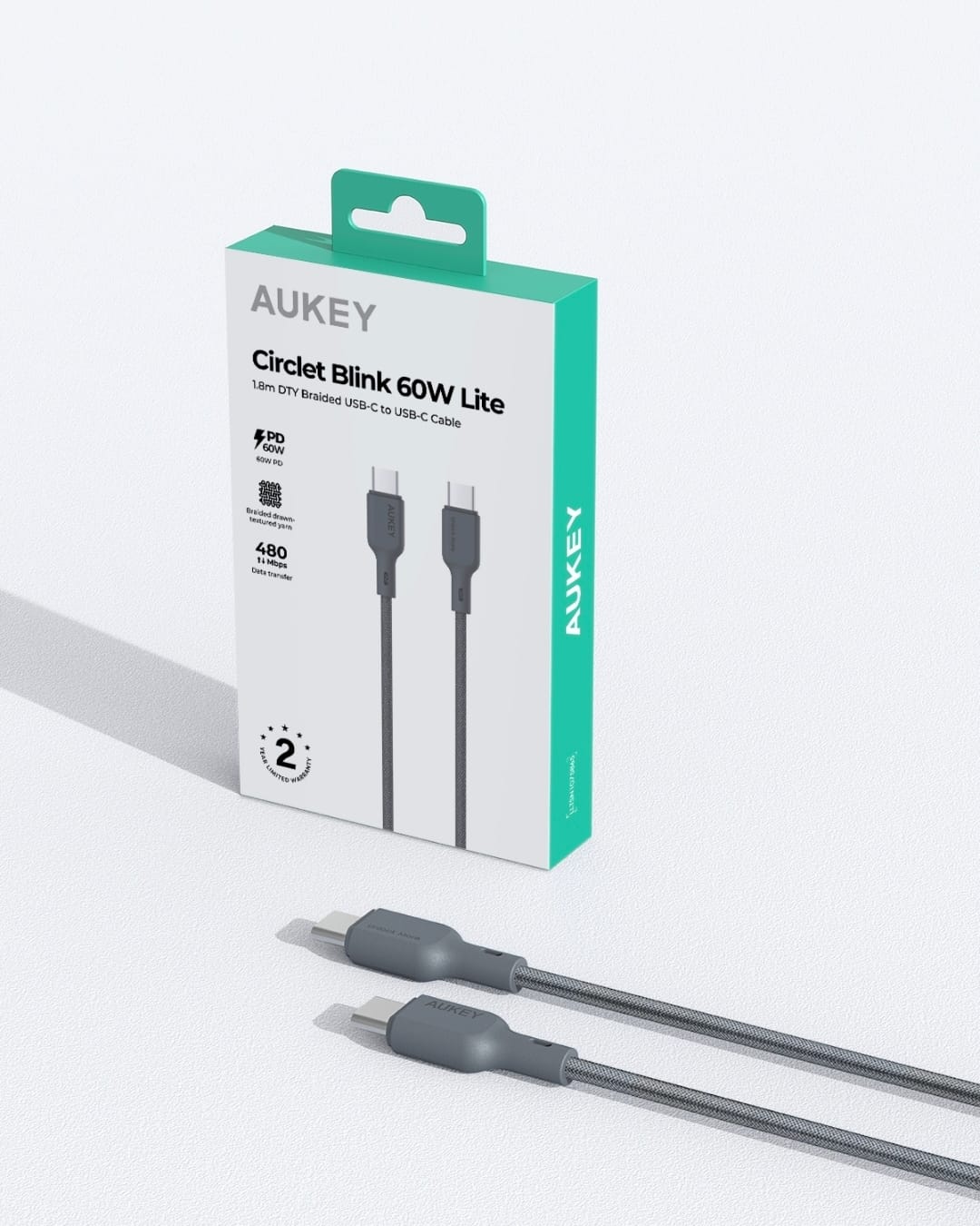 أوكي Circlit Blink 60W كيبل شحن ومزامنة ، مضفر من خامة DTY، USB-C إلى USB-C ، برأس من الألمنيوم ، طول 1.8م ، CB-DCC062 ، ضمان عامين